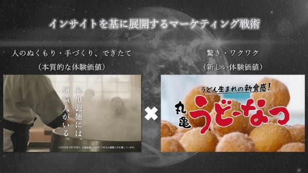 我々は、日頃から消費者のインサイトを探求し続けて、インサイトをベースにマーケティング戦略を作っています。外食全体のインサイトは大きく2つあると考えています。一つ目は、人の手の温もりや手づくりです。本質的な価値としては、昨今DX化が進み、 効率化などが叫ばれる中で、逆に人の温もりや手づくりを求められていることです。讃岐の製麺所にいるかのような空間の中で手づくりのおいしいうどんを食べていただく体験価値だと考えています。二つ目は、新しい価値ですが、驚きやワクワク感を外食に求めていることです。この2つを大きなインサイトと捉え、本質的な価値と、新しい価値を創ることの両立をマーケティングで実践しています。