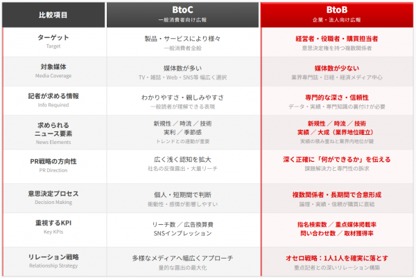 BtoBとBtoCでは、ターゲットから求められる情報の質まで異なります。下表で整理します。