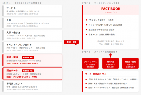 BtoB広報で最も重要なのが「ファクト開発」です。自社が持つ情報を体系的に整理し、メディアが取り上げやすい「使える情報」に磨き上げます。ファクトは以下の7カテゴリに分類して整理します。